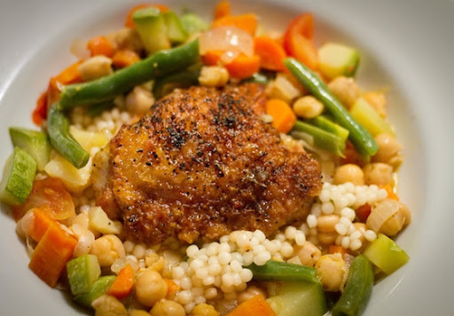 Coat chicken thighs in salt and paprika. Heat small amount of olive oil in a large dutch oven and brown chicken thighs until golden. Put aside on a plate, in the oven to keep warm (low heat 200). Add shallot to the same pot, stir and cook until slightly soft, about 5 minutes. Add carrots, zucchini and green beans, stir and cook about 5 minutes. Add 2 cups of the stock along with the chick peas. Low heat to a simmer and cook. Stirring occasionally. Cook the couscous using the leftover 2 cups of stock instead of water. 10 minutes before serving add the tomato and the chicken thighs to the veggie mixture. Pour any juices that were left from the chicken thighs into the pot. Serve on a bed of couscous. Pass the harissa. Serve. Eat.