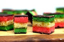 Divide batter among 3 bowls. Stir red food coloring into one and green food coloring into another, leaving the third batch plain. Set white batter aside. Chill green batter, covered. Pour red batter into prepared pan and spread evenly with offset spatula (layer will be about 1/4 inch thick).