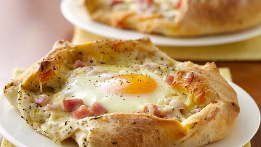1.- Heat oven to 350°F. Spray cookie sheet with Crisco® Original No-Stick Cooking Spray. Carefully unroll loaf of dough onto cookie sheet; cut in half lengthwise and crosswise to form 4 squares. Sprinkle dough squares with basil and rosemary. Top dough squares evenly with ham and cheese. Make small well in center of ham and cheese on each square.
