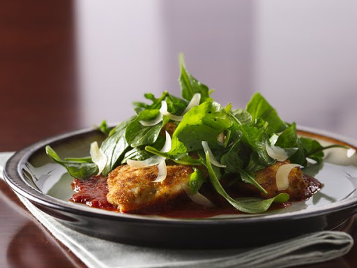 6 Place 2 chicken pieces on each of 4 plates, placing in the center. Spoon about 1/4 cup of the pasta sauce around chicken on each plate. Spoon salad on top of chicken. Top with shaved Parmesan cheese.