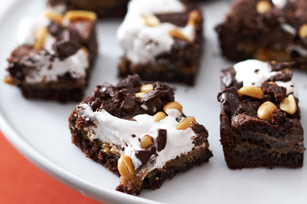 Combine peanut butter and remaining milk; spread onto crust. Top with spoonfuls of marshmallow creme and remaining cake mix mixture. Sprinkle with chocolate and nuts; press gently into cake mix layer.