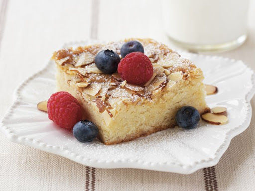 Bake 45 minutes or until tooth-pick inserted in center comes out clean. Cool completely in pan on cooling rack, about 1 hour. Use foil to lift cake out of pan; cut into squares. Sprinkle with powdered sugar. Garnish with berries.