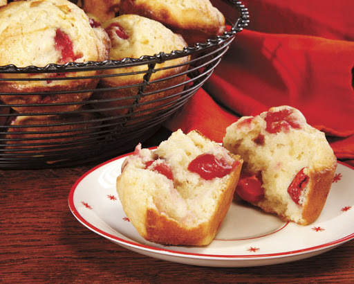 Preheat oven to 400°. Grease and flour muffin tin cups or line with paper muffin cups. Combine flour, soda and salt in a bowl and mix well. In a separate mixing bowl, cream together the butter and sugar until fluffy. Beat in the eggs, ALMOND and VANILLA EXTRACTS, sour cream and dry ingredients. Mix until just moistened (overmixing will make the muffins tough). Fold in the cherries. Fill the muffin cups about 2/3 full with batter. Bake at 400° for 20-25 minutes or until a toothpick comes out clean and the tops are lightly browned.
