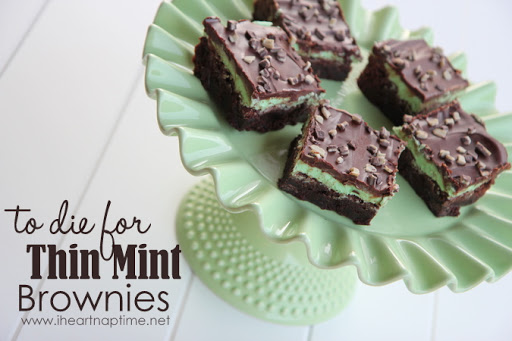 Make brownie mix according to package. Fold in thin mints and pour into a greased 9x9 pan. Bake according to package directions. Once your brownies are done let them cool for about an hour. In a medium sized bowl mix 4 TB butter, powdered sugar, evaporated milk, peppermint extract and green food coloring until fluffy. Spread mint frosting over brownies. Refrigerate 1 hour. For chocolate glaze, combine 4 TB butter, chocolate chips and melt for 1 minute in the microwave. Once chocolate chips are melted, stir in vanilla. Pour over green frosting and spread by tipping pan. Sprinkle andis mints on top. Refrigerate for 1 hour before cutting.