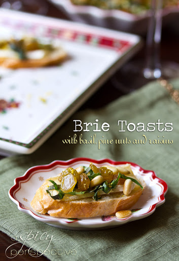 Meanwhile, mix the golden raisins, pine nuts, basil, and lemon zest in a small bowl. Once the brie toasts come out of the oven, top each toast with a sprinkle of the basil mixture.