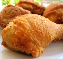One piece at a time, roll chicken in flour mixture and drop into hot oil.
