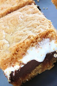 Divide dough in half and press half of dough into an even layer on the bottom of the prepared pan. Place chocolate bars over dough. Two 5 oz. Hershey’s bars should fit perfectly side by side, but break the chocolate (if necessary) to get it to fit in a single layer no more than 1/4 inch thick. Spread marshmallow fluff evenly over the chocolate layer.