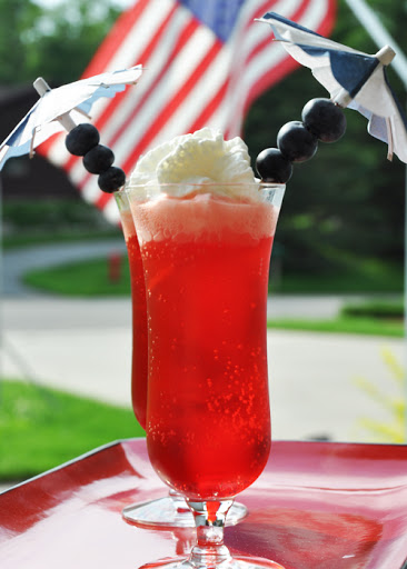 Top with whipped cream and blueberries. Garnish with a stir stick strung with blueberries if desired. Serve immediately.