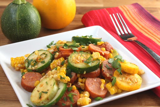 Heat a large nonstick skillet over medium heat. Coat pan with cooking spray. Add kielbasa. Cook 5 minutes or until browned, turning once. remove kielbasa from pan and keep warm. Coat pan with cooking spray. Add zucchini and corn. Cook 4 minutes, stirring frequently. Stir in tomatoes, water and pepper, scraping pan to loosen browned bits. Cover and cook 4 minutes or just until tomatoes begin to burst. Return sausage to pan. Cook uncovered 2 minutes or until liquid almost evaporates. Serving size: 1-1/4 cup