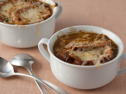 4. Preheat the broiler. Divide the soup between 4 (16-ounce) oven proof bowls or ramekins and arrange them on a baking sheet. Top each bowl evenly with 2 baguette slices and top with the cheese. Put under the broiler until the cheese is melted and lightly browned, about 1 minute. Sprinkle with the chives and serve.