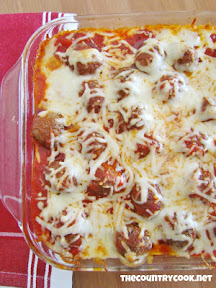 Gently mix together spaghetti sauce, water and meatballs.