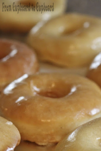 5. Heat oil in a deep-fryer or large heavy skillet to 350 degrees F (175 degrees C). Slide doughnuts into the hot oil using a wide spatula. Turn doughnuts over as they rise to the surface. Fry doughnuts on each side until golden brown. Remove from hot oil, to drain on a wire rack. Dip doughnuts into the glaze while still hot, and set onto wire racks to drain off excess. Keep a cookie sheet or tray under racks for easier cleanup.