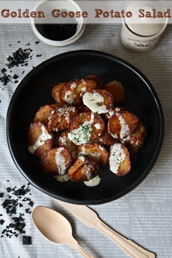 After roasting the potatoes in the goose fat so that they crisped up bronzed, golden and crunchy I seasoned the crunchy, golden potatoes and drizzled some tangy, creamy and spicy buttermilk dressing on top and as they say, everyone lived happily ever after.