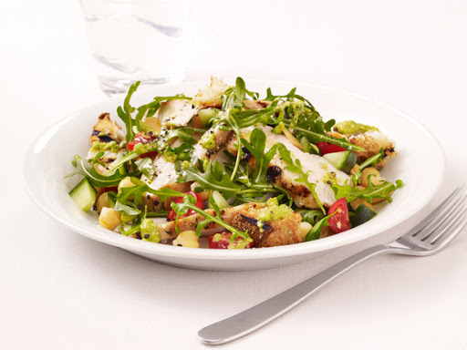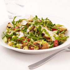 Cut the chicken into strips. Tear the bread into bite-size pieces. Combine the arugula, chickpeas, chicken, bread and the remaining cucumber, tomatoes, parsley and almonds in a large bowl. Add half of the dressing, season with salt and pepper and toss. Divide among shallow bowls. Drizzle with the remaining dressing.