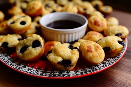 Spray a mini-muffin pan generously with baking spray. Fill cups 2/3 full. If using blueberries, drop 2 to 3 blueberries into each cup.