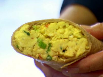 Pull the bottom of the tortilla up over the eggs, tuck the tortilla into the egg until it feels snug and roll it up, like making a nori roll. Cut the rolls into halves or thirds. Serve immediately or reheat on a panini press before serving.