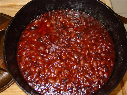 10 Mix the sugar, molasses, mustard, salt and pepper with 3 cups of hot water and pour over the beans.