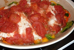 Heat oven to 375 F. Drizzle a little olive oil in the bottom of a medium sized baking dish. Layer in the spinach and drizzle with a little more olive oil. Place the peppers and onions on top and then the fish. Season with all seasonings. Top with stewed tomatoes.