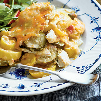 2. Drain tomatoes well, pressing between paper towels. Stir together tomatoes, chicken, and next 4 ingredients. Layer one-third each soup mixture, squash mixture, breadcrumbs, and Cheddar cheese in a lightly greased 6-qt. slow cooker. Repeat layers twice. Top with Parmesan cheese.