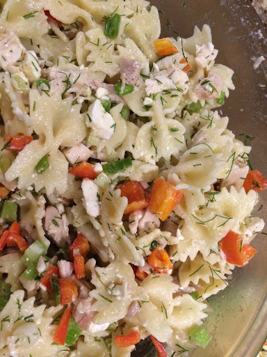 Pasta Salad: Heat a medium-size pot of lightly salted water to boiling. Add pasta and cook as per package directions, about 8 minutes. Drain and rinse with cool water; let cool until room temperature.