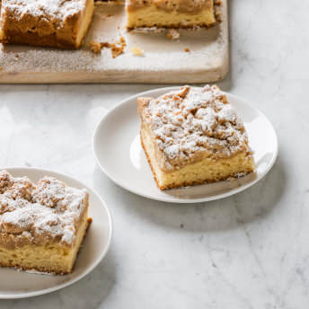 6. Bake until crumbs are golden brown, wooden skewer inserted in center of cake comes out clean, and cake portion registers about 215 degrees in center, about 35 minutes. Transfer dish to wire rack and let cake cool completely. Using spatula, transfer cake to cutting board; cut cake into 12 squares. Dust squares with confectioners’ sugar and serve.