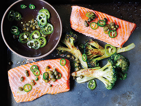 Serve salmon and broccoli drizzled with chile-caper vinaigrette.