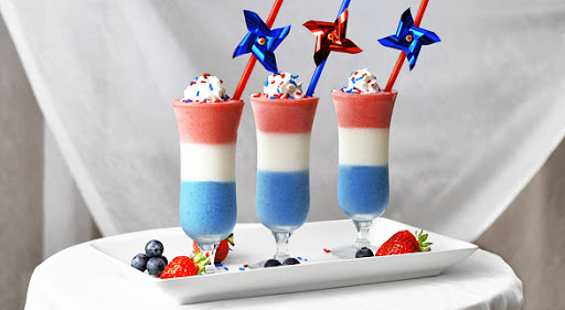 White Layer: Place all white layer ingredients EXCEPT VODKA into a clean blender pitcher. Pulse to chop ice, then puree until mixture is smooth. Add vodka and blend until mixed in. Remove glasses from freezer and fill to 2/3 high with the white mixture, so now the blue is 1/3 and the white is another 1/3 of the glass. TIP: Pour white layer slowly over the back of a spoon onto the blue layer to keep the colors from mixing. Return glasses to freezer for 10 minutes, or until set and you're able to add the next layer without the colors mixing.