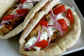 Heat pitas (I sprayed with some spray oil and then popped them in the toaster oven for a few minutes). Top with chicken, tzatziki sauce, diced tomatoes and sliced onions. Serve immediately.