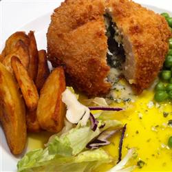 In a medium size deep frying pan, heat vegetable oil to medium-high. Fry chicken for about 5 minutes then turn over and fry for 5 minutes longer or until the chicken is golden brown. To test for doneness, cut into one of the rolled chicken breasts to make sure it doesn't have a pink interior. Serve immediately, garnished with a sliced lemon twist and a sprinkling or parsley.
