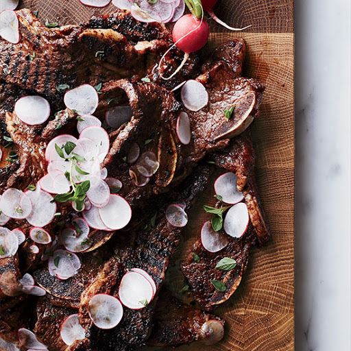Light the grill and oil the grate. Season the ribs with salt and pepper and brush with the blackberry sauce. Grill over high heat, turning once, until nicely charred, 3 minutes. Continue to grill for 2 minutes more, turning and basting with more sauce, until glazed. Garnish the ribs with radishes and chopped oregano; serve hot.