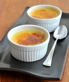 Add about a tablespoon of sugar onto the top of each custard and spread into an even layer. Using a kitchen torch and moving it slowly, but constantly, caramelize the topping. Topping can also be caramelized under the broiler.