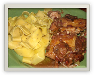 Return the browned chicken back to the pan, cover and put in oven @ 325 degrees and cook for 45 min to an hour. Remove from the heat and add the balsamic vinegar. During the last 15 min of the chicken cooking prepare the pasta. Cook according to package directions and serve with chicken and mushroom sauce.