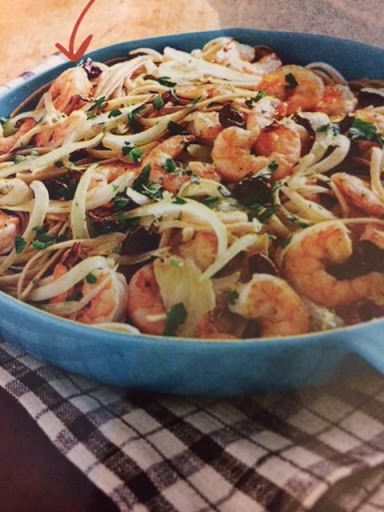 5. Remove cooked pasta from pot with tongs & add to skillet, along with 1 cup of the pasta water, the cooked shrimp & olives. Bring to a simmer & cook 1 minute. Stir in parsley. Serve immediately.