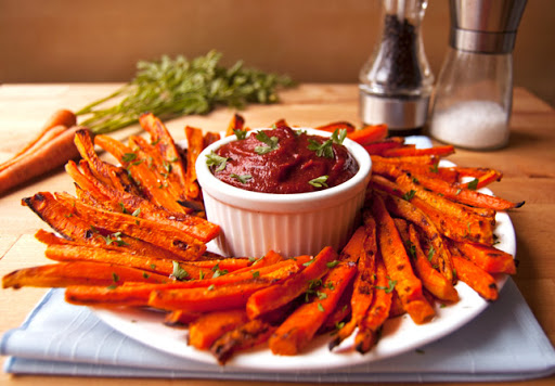 Preheat oven to 425°F. Spray 2 baking sheets with nonstick spray. Cut carrots into French-fry-shaped spears and lay them on the sheets. Cut your fries into similar sizes. Otherwise some may burn while others are barely cooked. Don't crowd your fries. If you put too many on one sheet, they won't crisp up. The thicker the fries, the longer the cook time.