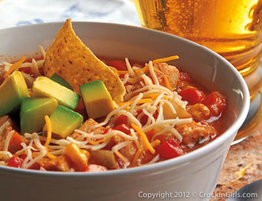 Combine all ingredients in the slow cooker, except for the garnishes... cook on HIGH for about 5-6 hours or on LOW for about 8 hours. Ladle into bowls and top each serving with avocado, cheese, and tortilla chips.
