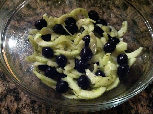 *Salad is 2 cucumbers, seeded, with black olives added (optional) and this dressing. Tastes better if allowed to marinate in fridge for a few hours before serving.*
