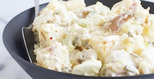 Cut the potatoes into medium sized pieces, and dice the eggs. Place into a large serving bowl.
