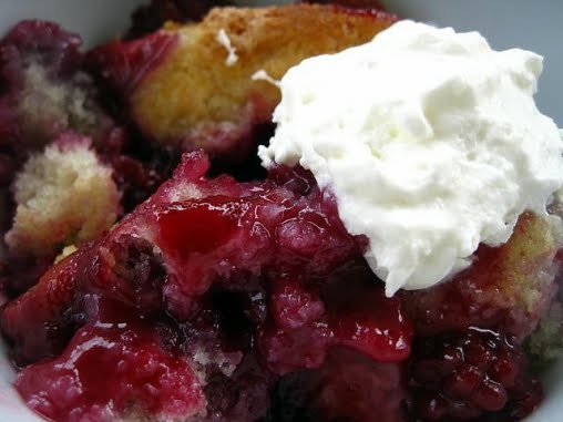 Preheat oven to 350 degrees. Cream 1 cup of sugar with the butter until fluffy. Add the flour, baking powder, salt, and milk; mix well. Pour into a glass baking dish. (I used a deep 1 1/2 quart casserole dish.) Pour blackberries on top of batter. Boil 2 cups of water. Add 1 cup of sugar to boiling water and pour over berries. Bake approximately 50 minutes or until top is golden brown. Allow to cool.