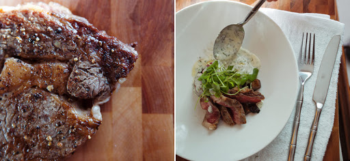 To give her richly-marbled rib-eye a nut-brown crust, Keith cooks it in a very hot pan, basting the steak with fat that has been infused with garlic and herbs, spooning it over the meat as it cooks.