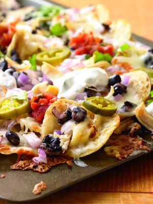 We've never found a nacho worth recommending in the restaurant world. The sad truth is that the tortilla chips are rendered a helpless vessel for thousands of calories of cheese, sour cream, and oily ground beef. And besides, who wants to dig through soggy nacho detritus in search of a chip crisp enough to bring from plate to mouth? This version ensures that every chip is evenly covered with protein-packed chicken and fiber-rich beans, plus enough salsa and lime-spiked sour cream to keep your mouth watering.
