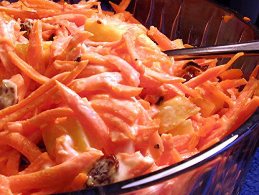 For the dressing, whisk together the sour cream, mayonnaise, sugar and salt. Pour the dressing over the carrots and add the pineapple and raisins. Toss together and serve.