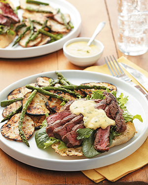 For the sandwiches, grill steaks, covered, to desired doneness, 2–3 minutes per side for medium-rare. Grill bread, covered, until lightly toasted, 1–2 minutes per side. Let steak rest 5 minutes; slice into strips.
