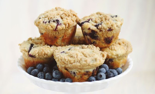 In another bowl, combine the flour, baking powder, and salt. Give that a stir so the baking powder and salt gets well distributed. Now add the sugar mixture, milk, and sour cream. Stir until a soft batter forms. Sprinkle the blueberries with just a little bit of flour, then add them to the batter. This helps the berries to not sink to the bottom of all your muffins, although some will anyway.