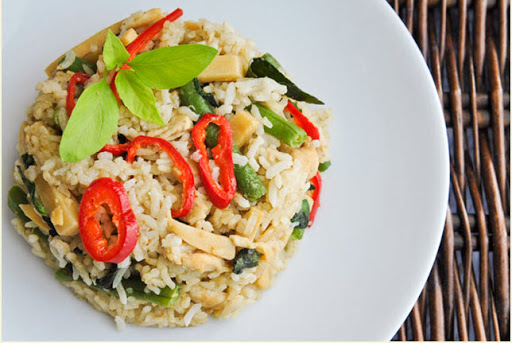Next add the cooked rice and mix everything together until well incorporated. Then add the basil leaves and red pepper slices. Cook for another minute, just until the basil is wilted. Serve with a sprig of basil and cucumber slices on the side. Enjoy!