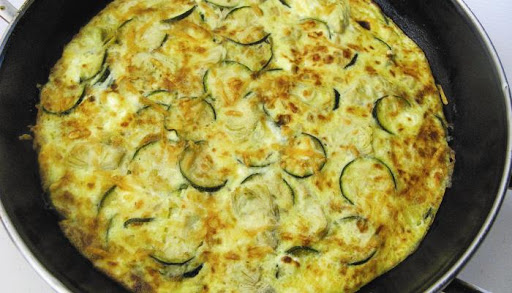 Caramelized Onion Frittata with Artichoke Hearts, Zucchini and Goat Cheese