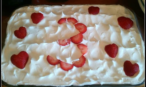 Break angel food cake into bite size pieces into a 9" x 13" dish. Fill the pan about 2/3-3/4 full...you want to have room for your strawberries and Cool Whip. I used almost my entire cake, minus about a 2 or 3 inch slice that *accidentally* got eaten while I was making this.