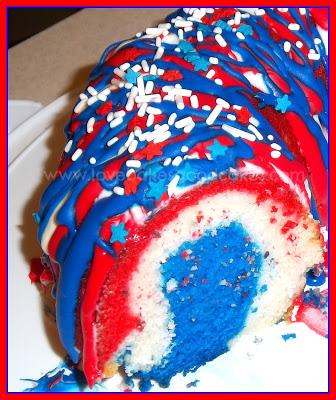 Pour red cake batter into bottom of pan. Carefully pour remaining white batter over red batter in pan. Carefully pour blue batter over white batter. (The blue batter does not need to cover the white batter completely, it looks better if it just forms a ring in the center of the white batter.) When you add the batter to the pan, do not mix with a spoon. Just pour it in so the colors don't mix but rather, just rest on top of each other in the pan.