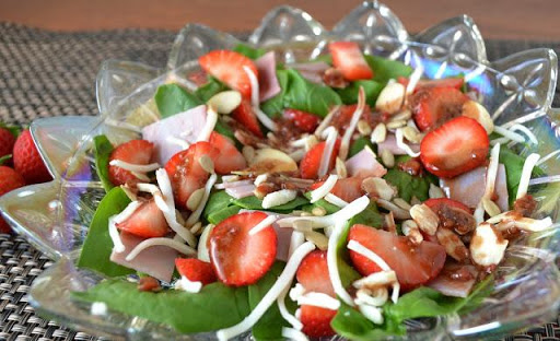 Toss all ingredients and top with strawberry balsamic vinaigrette. Serve immediately.