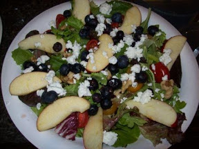Toss mixed greens with vinaigrette. Top with apple, blueberries, tomatoes, walnuts, and goat cheese.