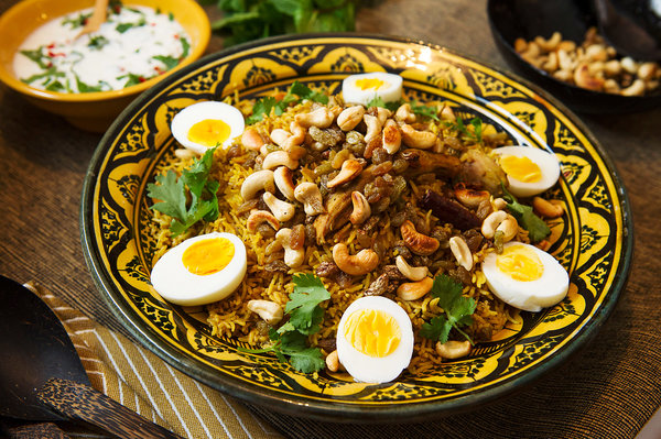 Pile the biryani on a large platter. Top with raisins and cashews. Garnish with hard-cooked eggs if desired and shower with cilantro. Serve with yogurt sauce.